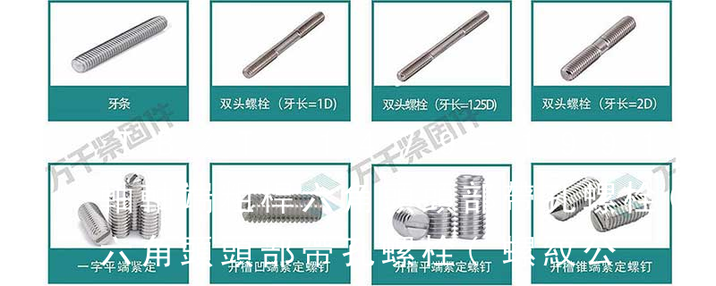1.六角頭(hexagon head) 2.六角頭法蘭面(hexagon head with flange) 3.方頭(square head) 4.T形頭T head (hammer head)5.扁圓頭mushroom head(truss head) 6.圓柱頭(cheese head) 7.圓頭(round head)8.盤頭(pan head)9.