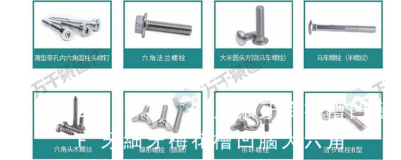 1.機螺釘 2.自攻螺釘 3.鉆尾螺釘 4.墻板釘 5.纖維板釘 6.木螺釘7.六角木螺釘 8.不脫出螺釘 9.組合螺釘 10.微型螺釘 11.家具螺釘 12.電子螺釘頭型:1.六角頭(hexagon head) 2.六角頭法蘭面(hexagon head with flange) 3.